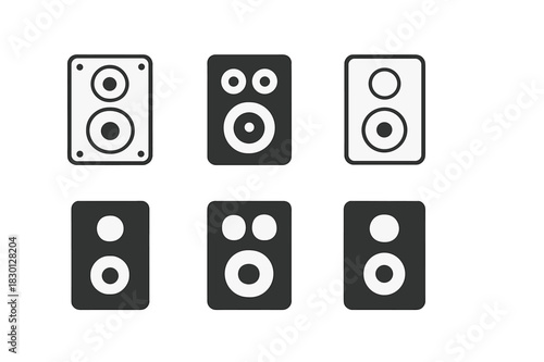 © Viacheslav, Fototapeta premium Stylized Speaker Icons. Sound system speaker. Icon set. Set Logo of sound system speaker: stereo speaker pair. harmonious logo variations of the same