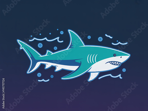 Naklejka premium Stylized teal and white shark swims near the surface amidst bubbles on deep blue