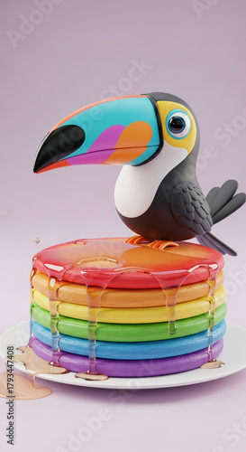 © PhotoArtHub, Naklejka premium Stylized toucan bird atop stack of colorful pancake rounds with drizzled syrup, representing tasty treat, breakfast, and whimsical food concept