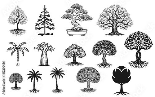 Obraz premium Stylized Tree Collection – Artistic Botanical Illustrations in Diverse Forms