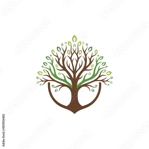 © Sarju, Fototapeta premium Stylized tree emblem with intertwining roots and budding leaves forming circular eco-logo.