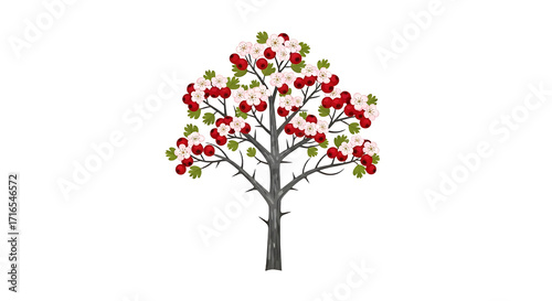 Fototapeta premium Stylized Tree with Red Berries and White Blossoms.