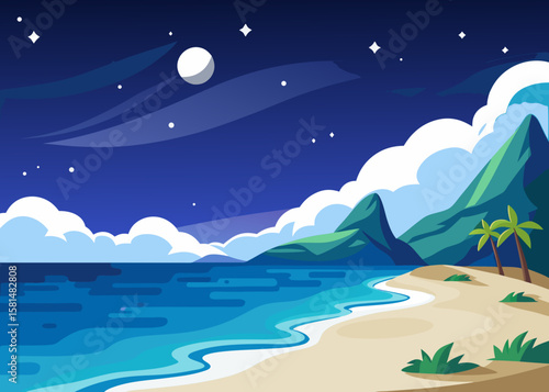 Fototapeta premium Stylized tropical beach scene under a starry night sky with a full moon