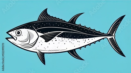 Fototapeta premium Stylized tuna fish in black over bright cyan background, with bold line art...