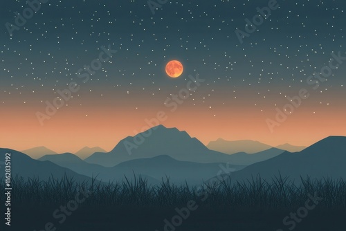 © Abdul, Obraz premium Stylized Vector Art of a Full Moon Glowing in a Dark Blue Night Sky with Soft Light and Gradients Over Rocky Mountains in the Background