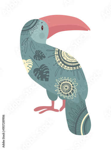 Fototapeta premium Stylized vector illustration of a toucan decorated with ethnic ornamental patterns. Tropical bird design isolated on white background.