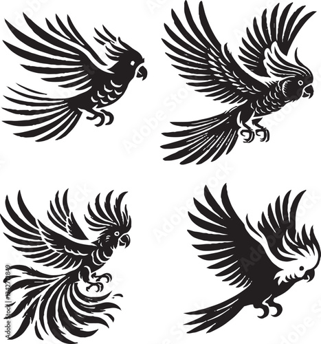 Fototapeta premium "Stylized Vector Silhouette Illustrations of Exotic Birds in Flight"