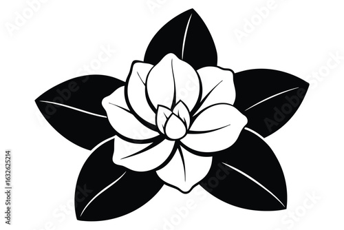 © Bably, Fototapeta premium Stylized white camellia bloom with solid black leaves evokes botanical elegance on white