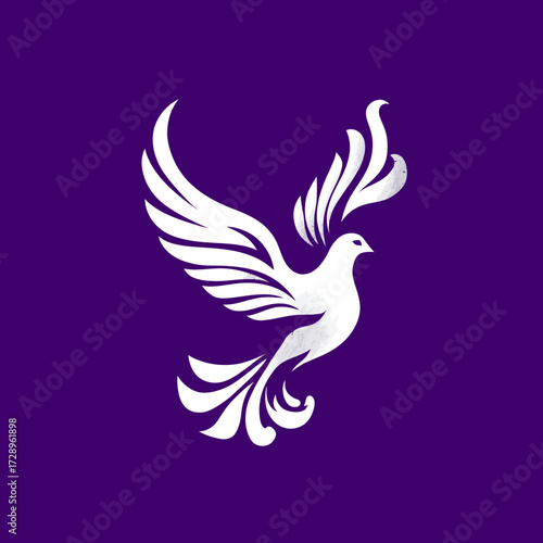 Obraz premium Stylized white dove with feathered wings on a solid purple background