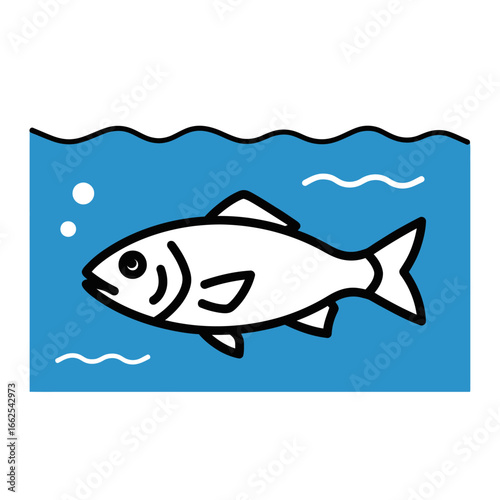 © Rizky Republik, Naklejka premium Stylized White Fish Swimming in Blue Water with Bubbles.