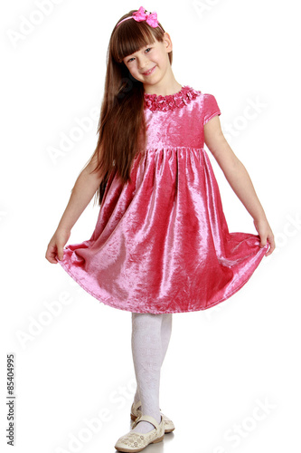 Naklejka premium Stylowa długowłosa dziewczyna w czerwonej aksamitnej sukience