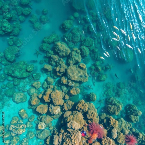 © IMRONI, Fototapeta premium Sublime Aerial View: Vibrant Coral Reef and School of Fish