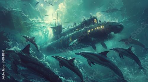 Fototapeta premium submarine and dolphins illustration , wildlife illustration submarine ,...
