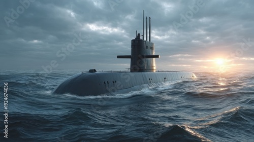 Fototapeta premium Submarine Emerging From Ocean Under Dramatic Sky at Sunset with Waves and...