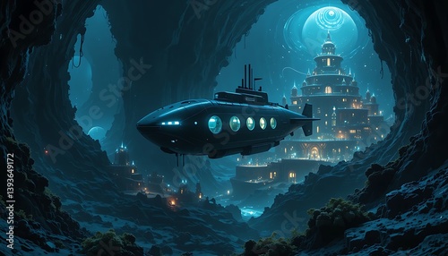Fototapeta premium Submarine Exploring Mystical Underwater City with Glowing Lights and...