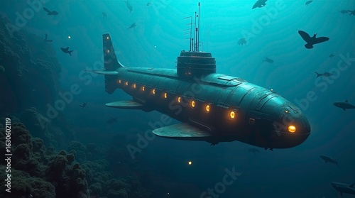 Fototapeta premium Submarine glides through vibrant coral reef ocean exploration underwater world aquatic scene deep