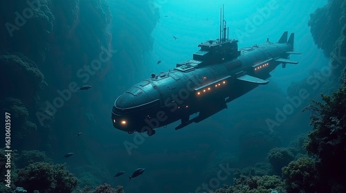 Fototapeta premium Submarine glides through vibrant coral reef ocean exploration underwater world aquatic scene deep