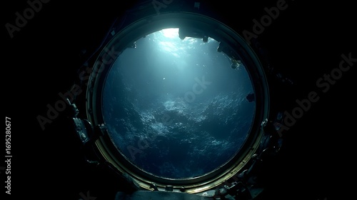 © Sekai, Fototapeta premium Submarine Periscope View: Looking Out at the Sea, Capturing Underwater Exploration and Maritime Adventure.