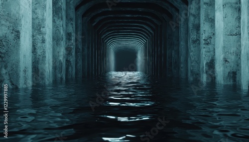 Fototapeta premium Submerged corridor with dark, textured concrete walls and rippling reflections, evoking a sense of mystery and isolation