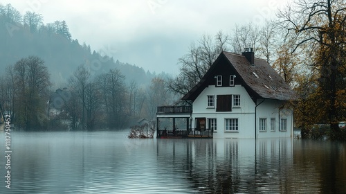 © Kitta Studio, Fototapeta premium Submerged House in Foggy Landscape Surrounded by Still Waters