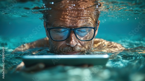 Fototapeta premium Submerged in the Blue: A Man's Underwater Digital Escape