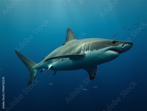 Fototapeta premium Submerged in the deep blue, a great white shark surveys its surroundings.