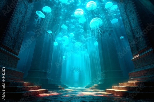 © Tichakon, Naklejka premium Submerged temple with glowing jellyfish