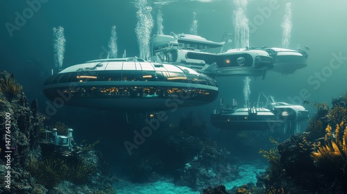 Fototapeta premium Submersible vessels float in an underwater environment.