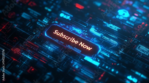 Obraz premium Subscribe Now! Futuristic digital interface with glowing button.