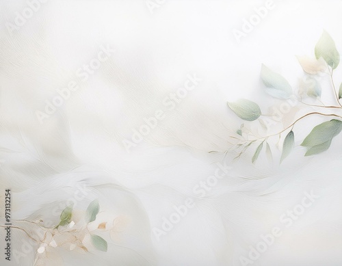 © Suchada, Obraz premium Subtle botanical illustration featuring delicate green leaves and branches on a soft, textured white background with an airy feel.