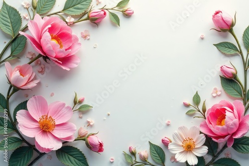 © Pornsuda, Fototapeta premium Subtle floral damask, delicate blossoms & acanthus leaves, print, white, vintage
