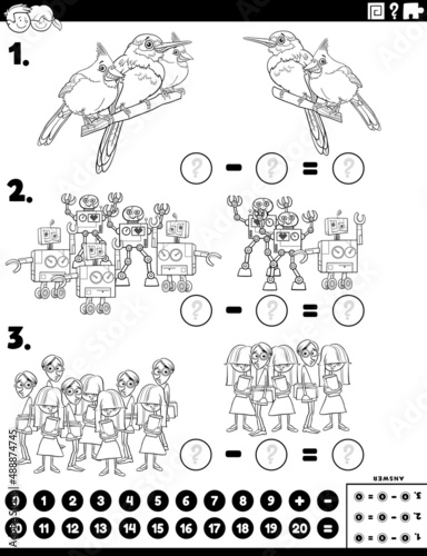 © Igor Zakowski, Fototapeta premium subtraction task with cartoon characters coloring book page