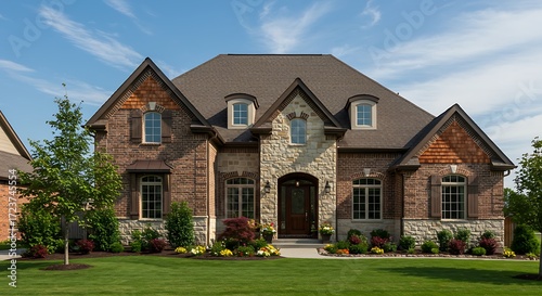 © Jawad, Obraz premium Suburban brick and stone home with cedar roof