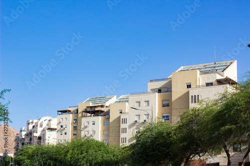 © Artem Kniaz, Obraz premium suburban European city street living houses with green tree and clear summer weather time