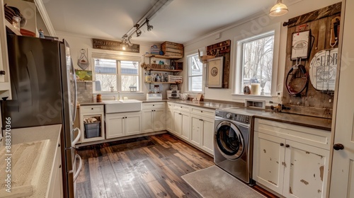 © Salman, Fototapeta premium suburban farmhouse with a spacious laundry room, featuring antique washboards as decor, modern appliances, and ample natural light