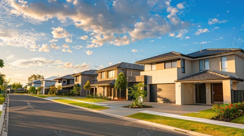 © Imsuniyah, Obraz premium Suburban Homes in the Golden Hour