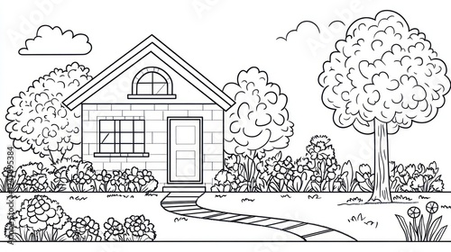 Obraz premium Suburban house, garden, sunny day, coloring page