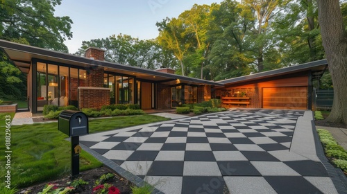 © Salman, Fototapeta premium suburban house with mid-century modern styling, complete with a geometric driveway and a uniquely designed mailbox