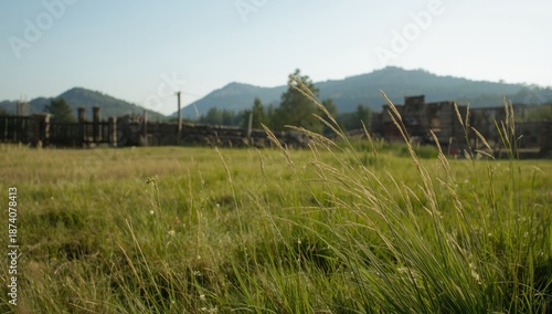 Fototapeta premium Suburban landscape with wild grass, highlighting urban greenery and ecological balance