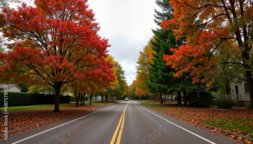 © Nataly, Obraz premium Suburban Street Lined with Colorful Autumn Trees.