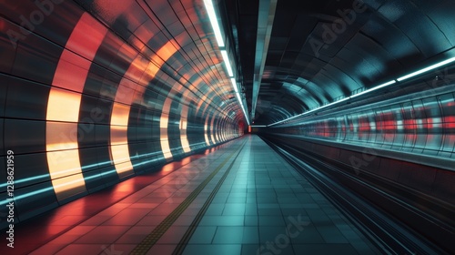 Obraz premium Subway Station Abstract: Metro Tunnel with Red and Teal Light Patterns AI Art