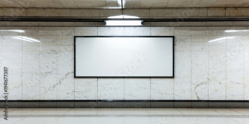 Fototapeta premium Subway station interior features blank billboard. Tiled walls, dark flooring, bright lighting create stark contrast. Minimalist aesthetic.