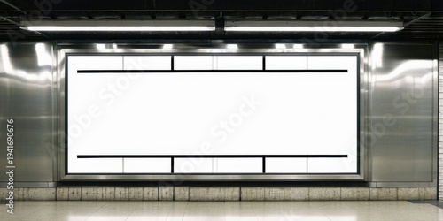Obraz premium Subway station interior features large blank billboard. Metal walls, tiled floor, dim lighting create stark contrast. Empty space dominates scene.