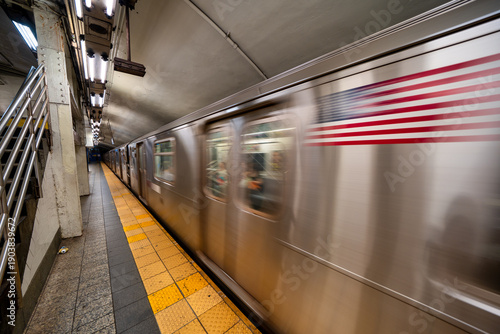 Fototapeta premium Subway train arriving at station in New York City underground transportation...