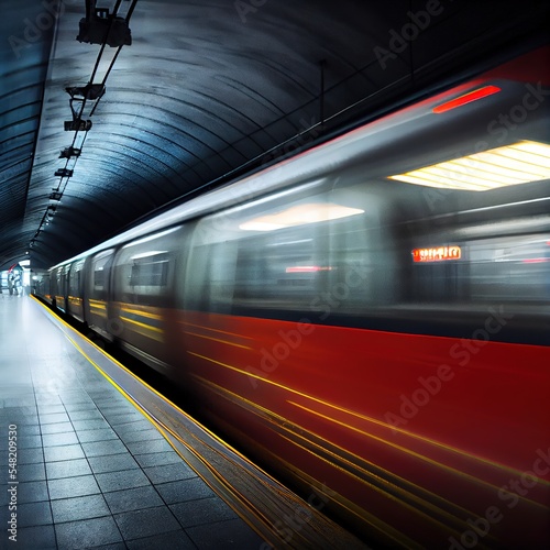 © Cheport, Fototapeta premium Subway train at the platform blurred in motion. Photorealistic illustration generated by Ai