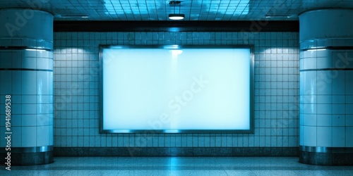 © antishock, Fototapeta premium Subway tunnel features illuminated blank billboard. Blue tones dominate interior space, creating dramatic effect. Minimalist composition.
