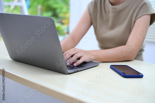 Fototapeta premium Successful Asian businesswoman sitting at desk working using laptop computer...