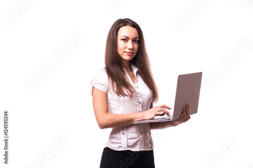 Naklejka premium Successful business woman holding a laptop - isolated over white