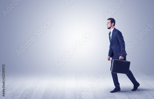 Obraz premium Successful businessman walking in front of an empty wall with briefcase on his hand