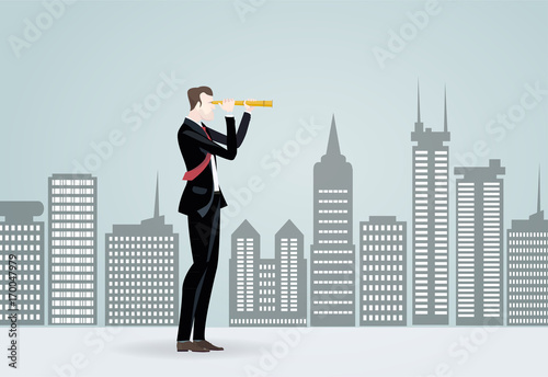 Fototapeta premium Successful businessmen looking with the telescope in the city and red growth...